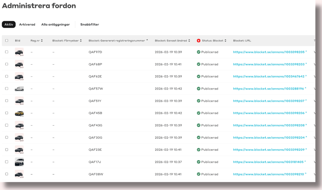 Efter migreringen till Blockets nya API har vi lagt till fler kolumner i vyn “Administrera fordon”. Du kan själv välja vilka som ska visas via inställningarna i tabellen.